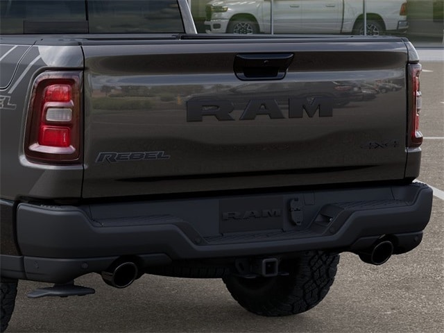 Bed Utility Group (Exterior 115V AC Outlet, MOPAR 4 Adjustable Cargo Tie-Down Hooks, and MOPAR Spray in Bedliner), Quick Order Package 21W Rebel, Rebel Level 2 Equipment Group (115V Auxiliary Rear Power Outlet, 14.4" Touchscreen Display, 2-Door Passive Entry, Front Door Locks, 4G LTE Wi-Fi Hot Spot, Accent Color Door Handles, Accent Color Premium Power Mirrors, Accent Color Tailgate Handle, Apple CarPlay, Auto Power-Folding Mirrors, Auto-Dimming Exterior Driver Mirror, Black Painted Exterior Mirrors Caps, Connected Travel and Traffic Services, Connectivity - US/Canada, Convex Wide-Angle Exterior Mirror Insert, Disassociated Touchscreen Display, Driver Seat Memory, Dual Wireless Charging Pad, Exterior Mirrors Approach Lamps, Exterior Mirrors Courtesy Lamps, Exterior Mirrors with Heating Element, Exterior Mirrors with Memory, Exterior Mirrors with Supplemental Signals, Front Passenger Interactive Display, Global Telematics Box Module, Google Android Auto, GPS Antenna Input, GPS Navigation, Harman/Kardon 19 Speaker Premium Sound, HD Radio, Heated Second Row Seats, Integrated Center Stack Radio, Integrated Voice Command with Bluetooth, Media Hub with 2 Charge Only USBs, Off-Road Information Pages, Power 2-Way Passenger Lumbar Adjust, Power Adjust 8-Way Front Passenger Seat, Power Adjustable Pedals with Memory, Power Tailgate, Proximity Approach/Departure Lamps, Radio: Uconnect 5 Nav with 14.4" Display, Radio/Driver Seat/Mirrors/Pedals Memory, Rain Sensitive Windshield Wipers, Rear Window Defroster, Security Alarm, SiriusXM Radio Service, SiriusXM with 360L, Smartphone as a Key Capable, and USB Host Flip), 10 Speakers, 3.92 Rear Axle Ratio, 4 Way Front Headrests, 4-Wheel Disc Brakes, ABS brakes, Active Noise Control System, Air Conditioning, Alloy wheels, AM/FM radio: SiriusXM with 360L, Apple CarPlay/Android Auto, Auto High-beam Headlights, Auto-dimming Rear-View mirror, Automatic temperature control, Black Exterior Mirrors, Brake assist, Bucket Seats, Cloth/Vinyl Bucket Seats, Compass, Delay-off headlights, Dome Dual LED Reading Lamp, Driver door bin, Driver vanity mirror, Dual front impact airbags, Dual front side impact airbags, Dual-Pane Panoramic Sunroof, Electronic Stability Control, Front anti-roll bar, Front Bucket Seats, Front Center Armrest w/Storage, Front dual zone A/C, Front fog lights, Front License Plate Bracket, Front reading lights, Front Seat Back Map Pockets, Front wheel independent suspension, Full Length Upgraded Floor Console, Fully automatic headlights, Garage door transmitter, Heated door mirrors, Heated Front Seats, Heated front seats, Heated Steering Wheel, Heated steering wheel, Illuminated entry, Leather steering wheel, Low tire pressure warning, Manual Folding Exterior Mirrors, Navigation System, Occupant sensing airbag, Outside temperature display, Overhead airbag, Overhead console, Panic alarm, ParkView Rear Back-Up Camera, Passenger door bin, Passenger vanity mirror, Power 2-Way Driver Lumbar Adjust, Power Adjust 8-Way Driver Seat, Power door mirrors, Power driver seat, Power steering, Power windows, Radio data system, Radio: Uconnect 5 Navigation with 12.0" Display, RamBox Cargo Management System, Rear 60/40 Folding Seat, Rear anti-roll bar, Rear seat center armrest, Rear step bumper, Remote keyless entry, Speed control, Split folding rear seat, Steering wheel mounted audio controls, Tachometer, Telescoping steering wheel, Tilt steering wheel, Traction control, Trip computer, Variably intermittent wipers, Voltmeter, and Wheels: 18" x 8.0" Painted Mid-Gloss Black.