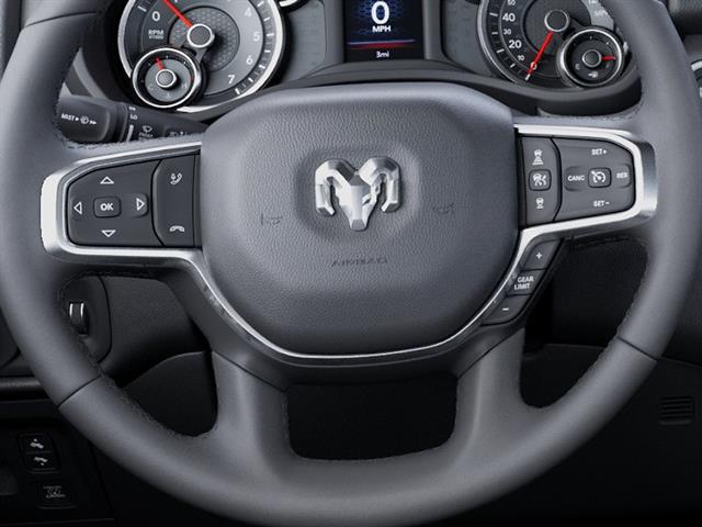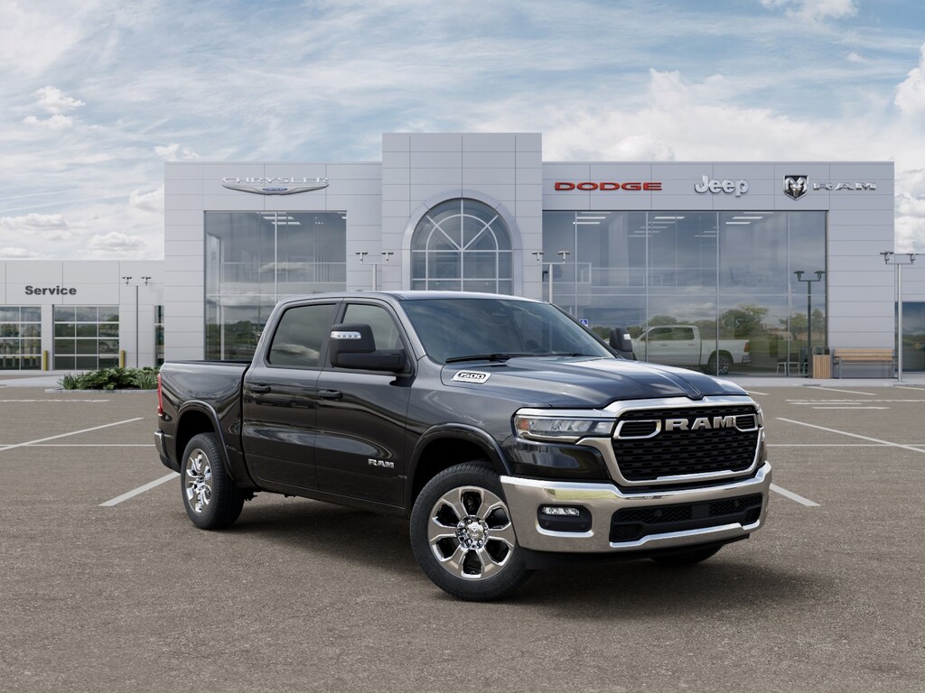 Discover the power and style of the new 2026 Ram 1500 Big Horn 4x4 Crew Cab in striking Black. With only 2 miles on the odometer, this truck features the robust Hurricane 3.0L Twin Turbo I6 engine delivering 420hp, paired with an 8-speed automatic transmission and advanced part/full-time 4WD system for superior capability. Enjoy comfort and convenience with heated front seats, heated steering wheel, power-adjustable pedals, and premium cloth bucket seats. Stay connected with Uconnect 5 W featuring an 8.4" touchscreen, Apple CarPlay, Android Auto, Bluetooth, and a 4G LTE Wi-Fi hotspot. Safety comes first with Blind Spot Detection, Forward Collision Warning-Plus, Adaptive Cruise Control with stop and go, ParkSense front and rear sensors, and a ParkView rear camera. Additional highlights include the Bed Utility Group (MOPAR spray-in bedliner, deployable bed step, adjustable cargo tie-downs), Trailer Tow Group (trailer brake control, trailer tire pressure monitoring), 20" chrome-clad aluminum wheels, and deep-tinted windows. This Ram 1500 Big Horn is ready to handle work and play-inside and out.
