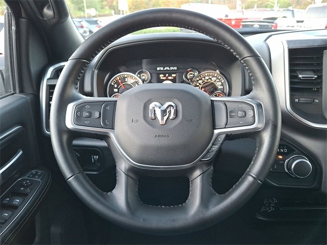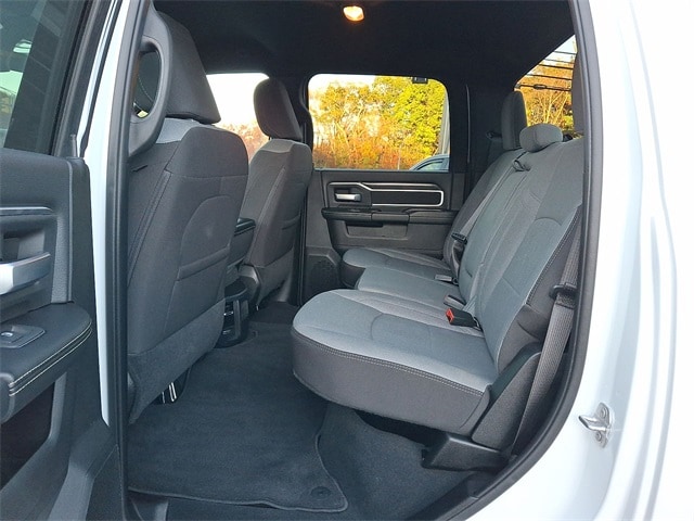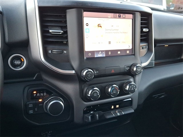 Bed Utility Group (LED Bed Lighting, MOPAR Deployable Bed Step, and MOPAR Spray In Bedliner), Protection Group (Tow Hooks), Quick Order Package 2GZ Big Horn, 2 Way Rear Headrest Seat, 3.73 Axle Ratio, 4 Way Front Headrests, 4-Wheel Disc Brakes, 40/20/40 Split Bench Seat, 6 Speakers, ABS brakes, Active Noise Control System, Air Conditioning, Anti-Spin Differential Rear Axle, Black Exterior Mirrors, Bluetooth Handsfree Phone & Audio, Brake assist, Bumpers: chrome, Center Hub, Center Stack Storage Drawer, Chrome Flat Cab-Length Side Steps, Cloth 40/20/40 Bench Seat, Compass, Connectivity - US/Canada, Delay-off headlights, Driver door bin, Dual front impact airbags, Dual front side impact airbags, Electronic Stability Control, Electronically Controlled Throttle, Emergency communication system: SiriusXM Guardian, Exterior Mirrors w/Heating Element, Front anti-roll bar, Front Center Armrest w/Storage, Front Fog Lamps, Front License Plate Bracket, Front reading lights, Fully automatic headlights, Global Telematics Box Module (TBM), GPS Antenna Input, Heated door mirrors, Illuminated entry, Integrated Center Stack Radio, Integrated Voice Command w/Bluetooth, Low tire pressure warning, Manual Adjust 4-Way Driver Seat, Manufacturer's Statement of Origin, Occupant sensing airbag, Outside temperature display, Overhead airbag, Overhead console, Panic alarm, ParkView Rear Back-Up Camera, Passenger door bin, Passenger vanity mirror, Power 2-Way Driver Lumbar Adjust, Power Adjust Mirrors, Power door mirrors, Power steering, Power windows, Radio data system, Radio: Uconnect 3 w/5" Display, Radio: Uconnect 5 W w/8.4" Display, Rear anti-roll bar, Rear Folding Seat, Rear seat center armrest, Rear step bumper, Remote keyless entry, SiriusXM Radio Service, Speed control, Tachometer, Tilt steering wheel, Tip Start, Traction control, Trip computer, Turn signal indicator mirrors, Variably intermittent wipers, Voltmeter, and Wheels: 18" x 8.0" Steel Chrome Clad.